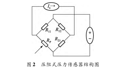 壓阻式壓力傳感器的物理原理主要來自于惠 斯頓電橋原理。因為傳感器受到外界的應變力之 后發生變化,這個變化量不便于直接測量要將 其轉化為測量起來更方便的電流或電壓的變化, 故用到了由四個電阻構成的惠斯頓電橋。其中電 橋平衡時,電橋相對臂電阻的乘積相等。這也是 電橋的平衡條件。如上圖四個精密電阻及11、Rl2 ^21和RP組成電橋,根據原理R11 = R12 = R21 = RP,輸出電壓為零此時電橋是平衡的。當外界壓力 作用于電阻時首先Re阻值增大,之后便會引起 一連串的變化