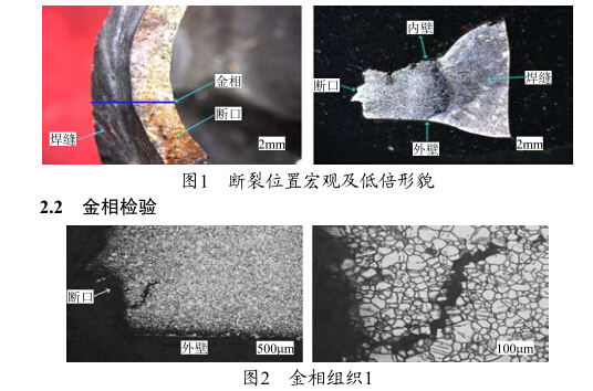 從圖1可見,斷裂的位置主要集中在焊縫熱影響區附近, 斷口表面布滿腐蝕產物。從低倍形貌可以看出,斷口表面有 二次裂紋,同時在引壓管的內壁也發現了從內壁向外壁擴展 的裂紋。