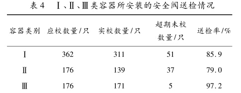 表4是將2013 ~2015年的壓力容器定期檢驗(yàn)報(bào)告按容 器類別進(jìn)行分類。m類壓力容器安全閥的送檢率顯著高于 I、II類壓力容器。