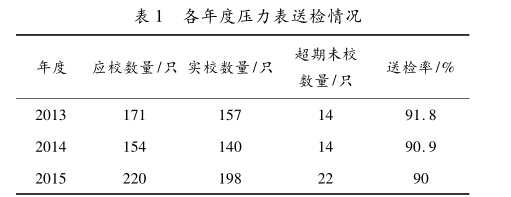 我市2013到2015年的定期檢驗(yàn)報(bào)告中統(tǒng)計(jì)出的壓力 表送檢情況見表1。由于部分壓力容器未設(shè)計(jì)安全附件,還 有一些壓力容器的安全附件安裝在管路上而不在定期檢驗(yàn) 范圍內(nèi),所以統(tǒng)計(jì)得到的壓力表比壓力容器的數(shù)量要少。