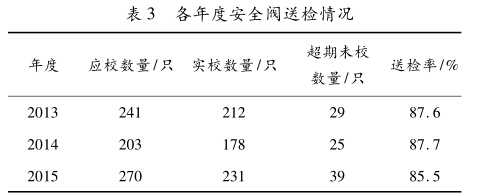 我市2013到2015年各500份定期檢驗(yàn)報(bào)告中統(tǒng)計(jì)出的 安全閥送檢情況見表3。由于部分壓力容器未安裝安全閥, 統(tǒng)計(jì)得到的安全閥數(shù)量比壓力容器數(shù)量要少。