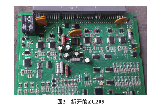 在駕駛室左側門窗下找到了ZC205,打開后蓋,發(fā)現(xiàn)其 上的電子元件結構如圖2所示,其中有2個電阻元件已經(jīng)發(fā) 熱變色了。用電烙鐵分別燙取變色電阻的后,測量電阻正 常,重新焊好已變色電阻,將ZC205裝在正常車上試驗,儀 表工作正常,說明ZC205正常。