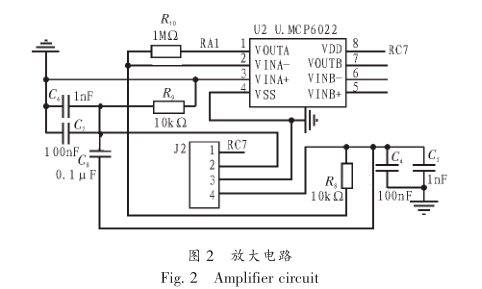 放大電路模塊主要是把傳感器的小信號(hào)進(jìn)行放大,然后 輸送給單片機(jī)處理。放大電路選用的芯片是MCP6022,它是 —個(gè)運(yùn)放芯片,低噪聲,穩(wěn)定性比較好,而且電源電壓符合設(shè) 計(jì)要求。
