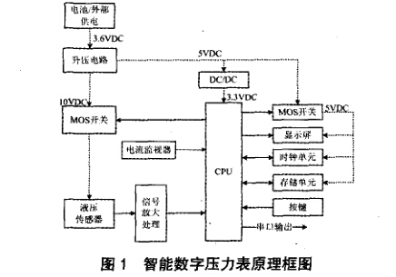 液壓傳感器供電由MOS開關轉換,信號器在休眠模式時,傳感 器無供電;當收到電流監控單元信號或收到CPU相應指令時,MOS 開關打通,傳感器供電工作,從而延長電池使用壽命。