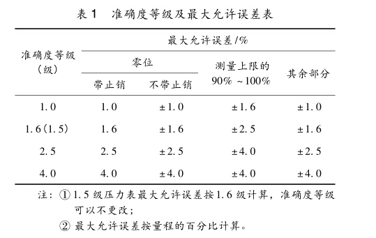 彈簧管壓力表的零位誤差檢定通常是由目力 觀察進行的,在示值誤差檢定前作一次、在示值 誤差檢定后作一次。對于帶有零位止銷的壓力表, 零位時指針應緊靠止銷,如若存在“縮格’,“縮 格”應不超過表1規定的最大允許誤差的絕對值; 對于不帶止銷的壓力表,零位時指針應指示在零 位標志內,零位標志的寬度不應超過最大允許誤 差絕對值的2倍。