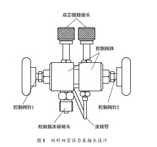 活塞式壓力計和壓力表校驗臺接頭都只有一 個標準接口(M20X1.5),在進行雙針雙管壓力 表檢定時,只能先安裝一個管路、調試檢定一個 指針及對應的彈簧管,結束后再安裝另一個管路 進行檢定。這樣,在同一檢定點,無法保證兩次 檢定時標準壓力值的一致,容易造成人為誤差, 同時也無法驗證雙管之間是否連通。可見,傳統 檢定方式不能完全滿足規程的要求。本文設計的 雙針雙管壓力表檢定接口,可以解決上述問題。 考慮一種雙接頭雙閥門設計,可以直接接入兩個管路了,通過兩個閥門單獨控制兩個管路的通斷, 這樣,即可以在同一壓力源下(即同一壓力下) 進行兩個管路的示指檢定,又可以控制閥門考察 兩個管路的連通性。