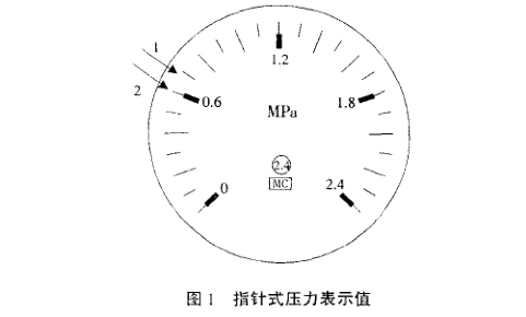 “反校法”是,選取精密數(shù)字壓力表作為標(biāo)準(zhǔn)器,在檢 定指針式壓力表時(shí),加壓或降壓至被檢表的整分度值處, 然后讀取標(biāo)準(zhǔn)數(shù)字表的示值。例如檢定壓力表的0.6 MPa點(diǎn)的示值誤差,常規(guī)的方法是:先加壓或降壓至標(biāo)準(zhǔn) 表0.6MPa點(diǎn),然后讀取被檢表的示值,如圖1箭頭1所 示,讀數(shù)為0.68MPa。而如果用“反校法”,則先加壓或降 壓至被檢表0.6MPa點(diǎn),即如圖1箭頭2所示,然后讀取 標(biāo)準(zhǔn)器的示值。