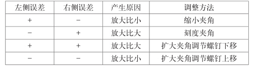 (3)示值先快后慢不同,起針可采用中間刻度,在 起針后可以對相同的壓力值進行增減,要求指針向左右兩 側偏轉的角度相等,并與中間刻度左右相鄰兩個帶有數字 的刻度相對正。否則以改變連桿夾角來達到目的。調整中 一般是出現以下幾種情況。