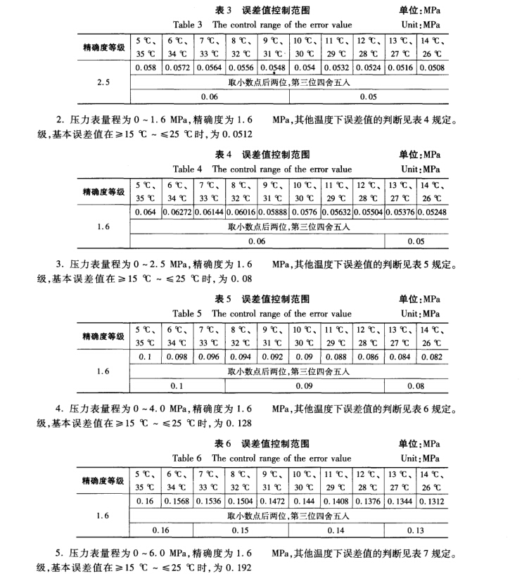 依據第2. 2節的規定對壓力表量程為0 ~ 1.0 MPa、0 ~1.6 MPa、0 ~2.5 MPa、0 -4.0 MPa、0 ?6.0 MPa,按式(1)計算后規定其各量程的誤差值。對其他精確度等級及量程的壓力表,其誤差值的規定按 式(1)計算即可。