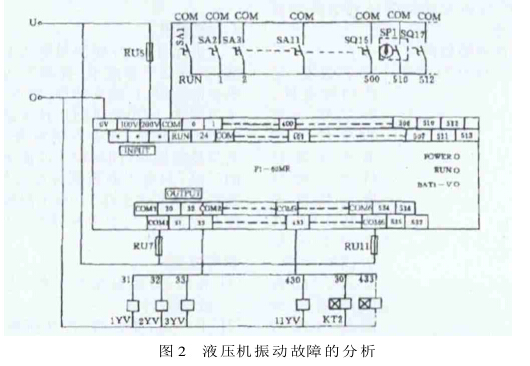對(duì)液壓機(jī)振動(dòng)故障進(jìn)行查找分析,也 液壓機(jī)不同的部位采用不同的編號(hào)進(jìn)行標(biāo) 注,首先對(duì)液壓機(jī)的PC機(jī)進(jìn)行故障診斷,由 圖2顯示,30端口的指示燈沒(méi)有產(chǎn)生指示信號(hào),但是在510端口,其指示燈產(chǎn)生了指示 信號(hào),但是因?yàn)樾盘?hào)強(qiáng)度較弱,所以將PC機(jī) 的運(yùn)行確定為故障,為了進(jìn)一步的確定故 障,將PC機(jī)故障診斷程序進(jìn)行改變,將輸出 端口改為433,PC機(jī)的故障不僅沒(méi)有排除, 還更加確定PC機(jī)有故障,因?yàn)榇藭r(shí)的510指 示燈產(chǎn)生了指示信號(hào),信號(hào)的強(qiáng)度較弱,有 閃爍的現(xiàn)象。在對(duì)液壓機(jī)的電接點(diǎn)壓力表 進(jìn)行檢查之后,確定電接點(diǎn)壓力表合格,在 接入液壓機(jī),使液壓機(jī)處于工作狀態(tài)時(shí),電 接點(diǎn)壓力表的觸點(diǎn)閉合電阻達(dá)到了 200 k Q,嚴(yán)重的存在接觸不良問(wèn)題,對(duì)這一現(xiàn)象 進(jìn)行診斷之后,發(fā)現(xiàn)是因?yàn)橐簤簷C(jī)在壓制 過(guò)程中壓力過(guò)大,造成液壓機(jī)的機(jī)身禪產(chǎn) 生振動(dòng),造成電接點(diǎn)壓力表觸點(diǎn)接觸不良, 觸點(diǎn)的電阻急劇增加,電壓下降,進(jìn)而造成 PC機(jī)沒(méi)有穩(wěn)定的電壓,而產(chǎn)生工作故障。