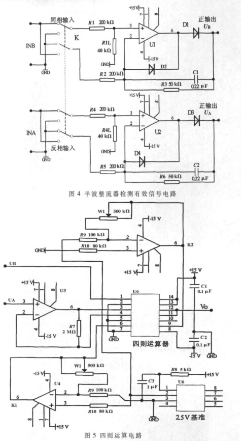 圖5是按式(7)設計的運算電路,其核心運算器U6 是模擬混合四則運算電路,其中U3為緩沖器,U4和其 外圍的各元件構成了 一個同相放大器,以調整參數K!,