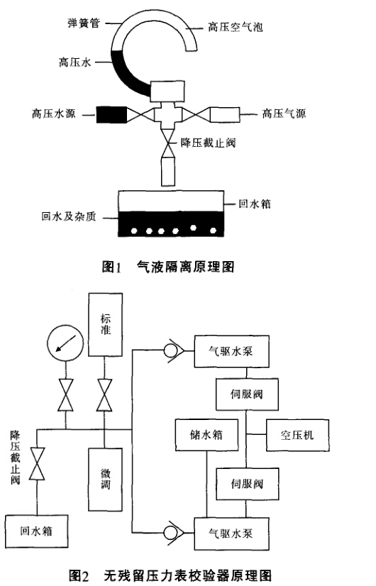 檢定壓力表后之所以有液體殘留是因為其彈簧 管是個形似秤鉤的盲管,如圖1所示。盲管的特點是一 頭開口一頭封閉,其內(nèi)充滿液體后即使口朝下也不會 流出。要想使液體自動排出必須有一股外力從彈簧管 頂端推動,該校驗器采取了先充人一定壓力的空氣, 再充人一定壓力的水液的方法進行檢表,即氣液隔離 法。其原理如圖1所示。這樣壓力表降壓歸零后高壓氣 泡將水液徹底排出。該項設計既消除了直接用高壓氣 檢表的危險性,又降低了制造高壓氣的成本,還可有 效防止水液殘留。