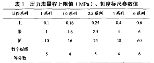 (2)常見壓力表量程上限值(MPa)、刻度標(biāo)尺參數(shù)值, 如表1。