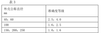 2、選擇壓力表時還要考慮儀表外殼公稱直徑與準(zhǔn)確度等 級的關(guān)系,各等級壓力表的外殼公稱直徑見表3。