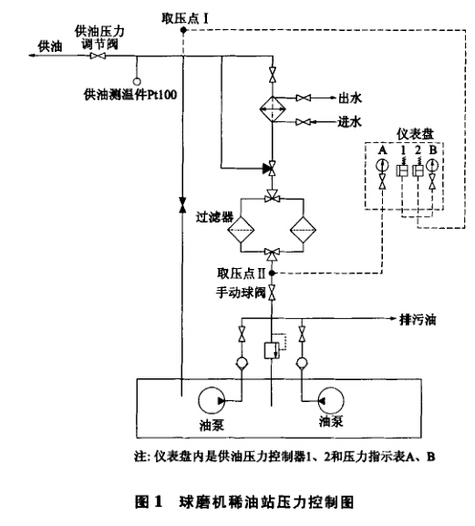稀油站原啟動控制方式為:開啟油站時2臺油泵 同時啟動,當壓力到達設(shè)定值0.2MPa時壓力控制器 動作,備用泵停止。從圖1可以看出,壓力控制器1、2 和供油壓力指示表B的取壓點均在I點,為油站供油 管道的最末端,從油站開始啟動到達壓力控制器設(shè)定 值,備用泵停止,大約需要Imin的時間。這樣造成每 次開啟時,油站壓力表(Y100,0~lMPa)和壓力控制器 (YWK-C-50,0~lMPa)都超過量程一倍以上,油泵 (CB10、25、63)超載運轉(zhuǎn),特別到冬季這種現(xiàn)象更嚴 重,壓力表每月最少更換五六塊,齒輪泵每年最少要 換到十幾臺,耗費了大量的人力和物力。
