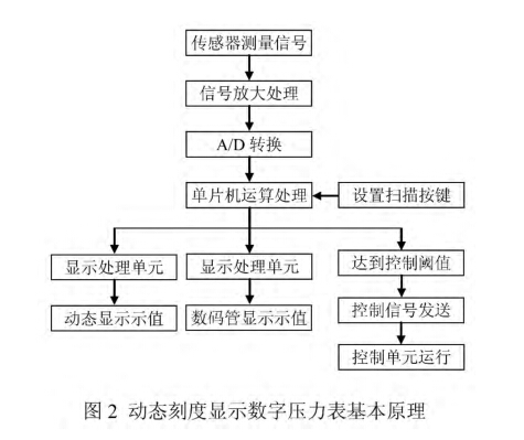 動態刻度顯示數字壓力表基本原理沿襲智能數 字儀表的設計思路,運用單片機對傳感器測量信號 進行采樣、運算處理、補償校正,然后將測量數值以 數字形式在液晶或數碼管等顯示屏幕顯示,同時將 測量數值轉換為LED燈亮滅的信號動態指示測量 值的大小。如果數字壓力表具有壓力控制功能,單 片機不斷對測量值與設定值進行比較,當達到控制 閾值時,發送控制信號啟動控制單元運行。其原理 如圖2所示。