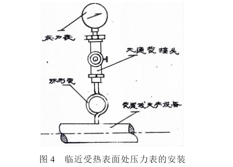 (6)壓力表不應該直接安裝在臨近鍋爐以及類似設 備表面受熱的地方使用,若需要安裝在這些地方使用的 壓力表,其壓力表與管道相接之間必須要通過環形管和 三通管接頭,如圖4所示。