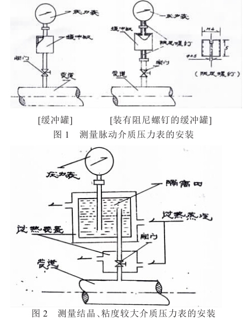 (2)被測介質急劇變化或為脈動壓力時,應附加緩 沖罐或阻尼螺釘。如圖1所示,若需測量結晶或粘度較 大的介質時,需安裝隔離器,并應設有過熱蒸汽裝置,如 圖2所示。