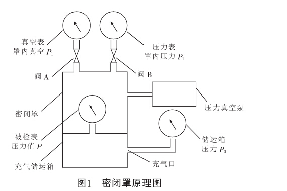 在圖1中,P是被檢壓力表標稱值;A是密閉罩內 產生的壓力或真空標準值(簡稱罩內壓力真空值);A 是儲運箱內原有壓力真值,P。可用與標準器同準確度 的測量儀從儲運箱充氣口測得。由測量儲運箱內部壓 力而泄漏造成的儲運箱氣壓改變如不超過規定范圍, 可以不予考慮。圖1中真空表、壓力表是用來測量密閉罩內真空度及壓力標準值的。