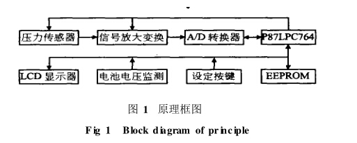 圖1為系統(tǒng)原理框圖,根據(jù)要求設(shè)計(jì),系統(tǒng)中,所有元 器件都選擇了低功耗的產(chǎn)品。系統(tǒng)硬件大體分為前置的壓 力傳感器、放大變換、A /D轉(zhuǎn)換和MCU控制部分及MCU外 圍的LCD顯示、電壓監(jiān)控、設(shè)定按鍵及EEPRCM這兩部分 組成。