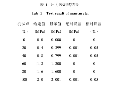 表1為用2MPa量程,0. 3 %線性傳感器制作的數(shù)字式 壓力表的測(cè)試結(jié)果。傳感器校準(zhǔn)環(huán)境溫度為17 C,濕度為 54%RH。測(cè)試環(huán)境溫度為28 C,濕度為68 %RH,校準(zhǔn)主 要設(shè)備為Druck的DP1605壓力校驗(yàn)儀,精度為0. 025 %。 實(shí)驗(yàn)測(cè)試結(jié)果表明:壓力表精度達(dá)到了 0. 1。/。以上,達(dá)到了 本設(shè)計(jì)的預(yù)期要求。