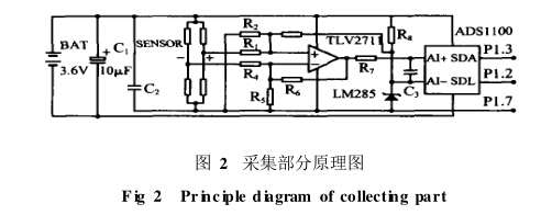 TLV2711被設(shè)計(jì)成差動(dòng)輸入方式,同時(shí),加入了 LM285 的1. 2V基準(zhǔn)做輸出偏移,以使輸出信號(hào)的范圍滿足A/D 轉(zhuǎn)換器的輸入要求。ADS1100被設(shè)計(jì)為單次轉(zhuǎn)換方式,轉(zhuǎn) 換結(jié)束即進(jìn)入待機(jī)狀態(tài),權(quán)衡轉(zhuǎn)換精度和轉(zhuǎn)換速度后,它的 輸出刷新時(shí)間設(shè)計(jì)為32SPS,能夠獲得14位轉(zhuǎn)換精度,單 轉(zhuǎn)換周期約30ms,對(duì)電源的能量要求較小。ADS1100的前 置放大器設(shè)定為8倍,整個(gè)模擬部分的放大倍數(shù)由 TLV2711根據(jù)傳感器具體情況來調(diào)整。