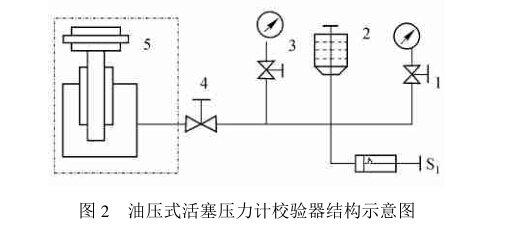 圖2為油壓式活塞壓力計校驗器結構示意圖。 制作時,選一臺不小于6MPa油壓式活塞壓力計校 驗器(筆者選擇的是西安儀表廠早期生產的活塞壓 力計校驗器),將標準活塞壓力計(包括連接座)和連接控制閥4之間的管子拆下,如圖2虛線部分,再把 油杯2拆下,然后在油杯拆下的連接座上裝一控制 閥,如圖1中2所示,再根據壓力校驗器的空間位 置,按圖1所示位置安裝氣液隔離器、放氣閥和活塞 壓力計及其連接管子。各部件安裝前,要對系統管 路進行無油脂清洗,安裝完畢后,對整個系統要進行 使用壓力范圍的氣密壓力試驗檢查,合格后方可使 用。