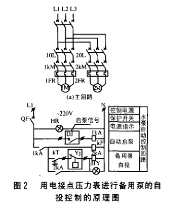 在電氣工程設計中,常遇到 水泵的電氣控制問題。一般情況 下,水電接點壓力表泵為2臺一一 1臺工作1臺備用,在工作泵出現 故障時,備用泵應能自投(特別是 消防水泵,備用泵必須盡快自投, 以滿足火災時對消防水的要求)。 常規設計中,備用泵的自投多采 用在控制回路中接入主接觸器的 常閉觸點來實現。筆者最近在幾 個工程實踐中,采用電接點壓力 表對備用泵進行自投控制,經過 調試、驗收,反應良好。下面以全 壓啟動水泵為例,對2種方案進行 比較。