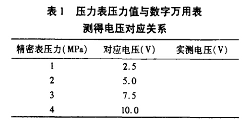 在進(jìn)行各項(xiàng)校準(zhǔn)之前,應(yīng)首先對(duì)AK-4型壓 力傳感器進(jìn)行校準(zhǔn)。傳感器1、4接口連接24 V電 源,2、3接口并入臺(tái)式數(shù)字萬(wàn)用表,壓力校驗(yàn)器上 安裝0.25級(jí)(0~6)MPa精密壓力表,壓力校驗(yàn)器 造壓,精密壓力表壓力值(MPa)與數(shù)字萬(wàn)用表測(cè)得 電壓(V)對(duì)應(yīng)關(guān)系如表1。