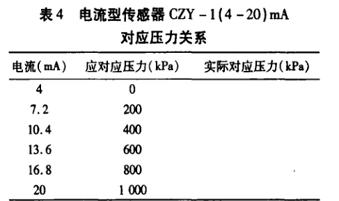 單擊桌面上“壓力表-電壓電流型”圖標(biāo),計(jì) 算機(jī)進(jìn)人電壓、電流型壓力變送器及配套儀表校驗(yàn) 主界面。選擇傳感器類型(如電流型CZY-1(4- 20)mA),單擊“傳感器校驗(yàn)”圖標(biāo),進(jìn)人電流型傳 感器校驗(yàn)界面。將D030 - EG三用表校驗(yàn)儀與試 驗(yàn)臺(tái)測(cè)試線(電流型)相連,三用表校驗(yàn)儀輸人一 個(gè)標(biāo)準(zhǔn)電流(mA),液晶顯示屏上“傳感器/壓力” 部分顯示一對(duì)應(yīng)壓力(kPa)。對(duì)應(yīng)關(guān)系如表4。