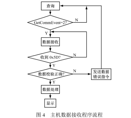 主機(jī)軟件的設(shè)計(jì)是基于VC + +平臺(tái)的MFC 編程實(shí)現(xiàn)。首先建立一個(gè)模態(tài)對(duì)話框,添加 MSComm控件,對(duì)所用計(jì)算機(jī)串口進(jìn)行參數(shù)設(shè)置 及初始化。數(shù)據(jù)接收是通過(guò)對(duì)GetCommlvenl()事 件的響應(yīng),然后將數(shù)據(jù)校驗(yàn)、保存并處理,在軟件前臺(tái)顯示。主機(jī)數(shù)據(jù)接收程序流程如圖4所示。