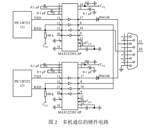 該多機(jī)通信系統(tǒng)除了單片機(jī)RS232C通信的硬 件要求外,還釆用了一塊MAX3223ECAP芯片和 一個(gè)IN4148 二極管實(shí)現(xiàn)多機(jī)通信的硬件電路,如 圖2所示。