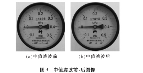 圖像預處理主要包括圖像去噪及圖像二值化處 理。相機拍攝被檢表圖像經數據線傳入計算機后, 因各種原因,圖像會帶有噪聲等干擾因素,會加大后 續算法的計算量。本系統通過使用中值濾波來濾除 圖像噪聲。同時為了減少后續算法計算量,我們還 需要對圖像進行二值化處理。