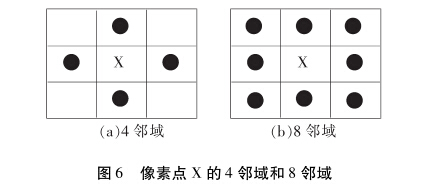 圖像中每個像素點,其周圍4個水平和垂直的 像素稱為該像素的4鄰域,其周圍4個水平和垂直 的像素和4個對角相鄰像素稱為該像素的8鄰域, 如圖6所示。連通域就是在一個像素集合中,所有 像素都以一種鄰接方式(4鄰接或8鄰接)相鄰接,并 與其他像素集合不相鄰。將圖5( b)進行連通域標記, 提取最大一塊連通域就能得到指針對象,如圖7所示。 同時對圖5 ( a)中刻度進行連通域標記。