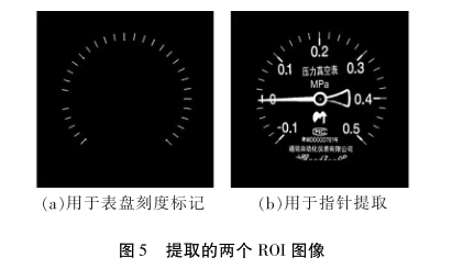 通過對表盤外圈進行擬合圓操作,可以得到一 個大概的圓心位置及其半徑,就可以提取感興趣區 域ROI,此系統一共提取兩個ROI,分別用于刻度的 標記及指針的提取。提取出的ROI如圖5所示。