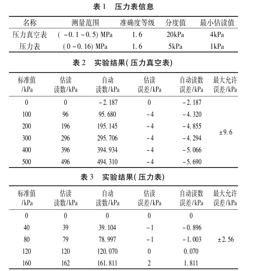 該系統在VS2013環境下編寫完成,選取的標 準表為ConST273數字式壓力校驗儀,選取的普通壓力 表的信息如表1所示,實驗結果如表2、表3所示。