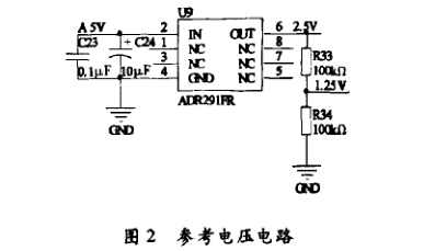 本系統(tǒng)采用的參考電壓由ADR291產(chǎn)生, ADR291是低噪聲、小功率參考電壓芯片。參考電壓 電路如圖2所示,其產(chǎn)生的2.5V參考電壓精度在0. 12%以上,滿足本系統(tǒng)高精度的要求。輸出2.5V經(jīng) 過電阻分壓后產(chǎn)生1. 25V作為A/D芯片的參考電 壓,為提高A/D芯片參考電壓的精度,圖2中的R33 和R34均采用l%o的高精密電阻。