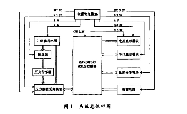 本系統(tǒng)旨在設(shè)計一款高精度微功耗的數(shù)字壓 力表,因此髙精度和微功耗是本設(shè)計的重點和難 點,必須從總體設(shè)計時就加以考慮。系統(tǒng)總功耗 一般包括元件級功耗和系統(tǒng)級功耗⑴,需要從這 兩方面人手才能達到系統(tǒng)微功耗的目的。