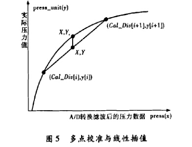 本系統(tǒng)最終采用11點校準的方式,即滿量程 的0%, 10%, 20%,…,100%,校準完成后,將校 準數(shù)據(jù)存人Flash數(shù)據(jù)存儲區(qū)。計算 當前壓力值時,首先將得到的當前壓力數(shù)據(jù)與校 準數(shù)據(jù)比較,得到當前壓力數(shù)據(jù)所在 的區(qū)間,采用線性插值的方法計算當前壓力值: