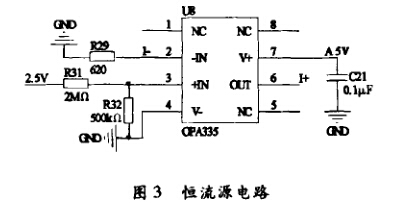 恒流源電路的核心芯片是OPA335,此芯片是 自動置零,單電源運算放大器。具有最大5(|^的 失調(diào)電壓,285RA的靜態(tài)電流,同時滿足了系統(tǒng)高 精度和微功耗的要求。恒流源電路如圖3所示, 利用運算放大器“虛短”和“虛斷”的特性設(shè)計,其 中電阻R29、R31和R32均采用1%的高精密電 阻,產(chǎn)生806皡的恒流源,【+和I-分別是壓力 傳感器的正、負電源輸人端。經(jīng)測試,此恒流源在 負載阻抗低于5kO時,穩(wěn)定可靠,滿足本系統(tǒng)壓 力傳感器的供電要求。