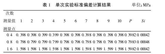 把1. 6 MPa 0.4級彈簧管式壓力表在0. 4 MPa、 0. 8MPa、1. 6MPa重復性條件下分別測量10次,獲得3組 測量列,具體數字見表1。