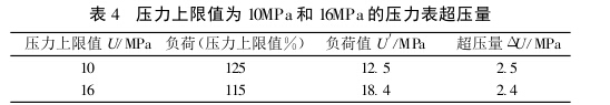 超壓實驗中,壓力上限值U<160MPa時,當U增 加,如應單調遞增,但事實并非如此。按照表2的計算 方式,壓力上限為10MPa和16MPa的壓力表超壓實驗負 荷值以及超壓量計算結果見表4: