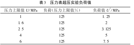 從表3中可以看出,壓力上限值U = 1MPa 2 5MPa 及6MPa時,超壓試驗負荷值分別為:1. 25MPa 3. 125 MPa 及7. 5MPa,超壓實驗標準器一般選用活塞式壓力計或彈 簧管式精密壓力表,而活塞式壓力計砝碼無法加壓至所 需壓力,需通過活塞有效面積,當地重力加速度等參數計 算出所添加的砝碼質量,實驗過程繁瑣且帶入一定量的 不確定度。理論上精密壓力表可以達到所需的負荷值, 但實驗裝置的氣密性很難保證0. 5h的時間內一直保持 相應的負荷值不變。因此實際上很難嚴格按照表3設計 的超壓負荷進行超壓試驗。
