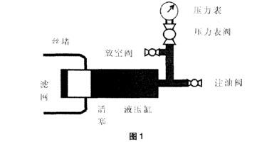 該裝置由二部分組成:①連接部分:由絲堵、表補心、濾網、壓力 表組成;②密封部分:由液壓缸、缸體活塞、密封墊圈、注油閥、壓力表 閥門。(見圖1)