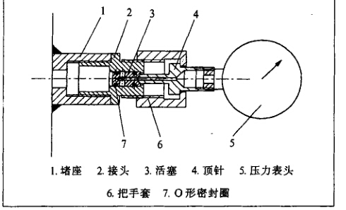 如圖所示,堵座直接焊接在所要測(cè)定壓力的輸 油(水)管線上。首先把活塞和接頭裝配好,把接頭裝 在堵座上,這樣在管道壓力(一般在10MPa左右)作 用下,活塞向上移動(dòng),形成密封,這些部件裝好后直 接放在井上。另外一些部件按圖示,把頂針塞人把手 套,裝上壓力表,要測(cè)壓力時(shí)隨身攜帶。使用時(shí)將把 手套慢慢旋上接頭,由于管內(nèi)壓力,在旋入的過(guò)程當(dāng) 中,頂針接觸活塞,此時(shí)頂針與活塞形成第一道硬密 封,在進(jìn)一步的旋入過(guò)程中,活塞繼續(xù)向前推移,管 線內(nèi)液體從活塞側(cè)面孔進(jìn)入頂針孔,即可測(cè)得壓 力。設(shè)計(jì)時(shí)考慮到第一道硬密封接觸面積小,有時(shí)密 封性能不佳,在結(jié)構(gòu)上可以設(shè)計(jì)第二道硬密封,即可 實(shí)現(xiàn)在測(cè)壓力時(shí)滴水不漏。
