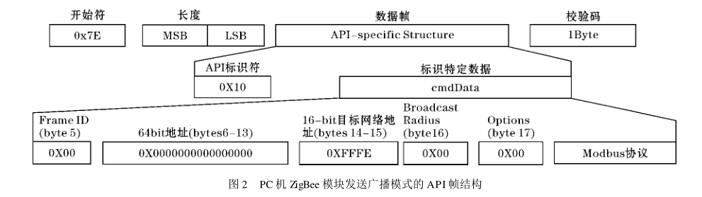 標準的Modbus是使用RS-232兼容串行接口,定義了連接口的針腳、電纜、信號位、傳輸波特率、奇偶校驗。 控制器能直接或經由Modem組網。原來的標定軟件采用Modbus協議是基于數據鏈路層的通信,而ZigBee的 API模式是網絡層的通信。這樣就要求在Modbus的基礎上加上API的協議層,才能讓標定軟件實現ZigBee的 順利通信。ZigBee的API模式幀結構框架如圖1所示,數據幀中API標識符cmdID表明cmdData中包含何種數 據。在本程序設計使用的XBee系列2模塊中,當cmdID = 0X10時,表明ZigBee傳輸數據請求;cmdID = 0X90 時,表明ZigBee接受數據包。最后一位的校驗碼(數據校驗和)是用來檢驗數據的完整性。