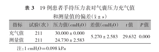 3.2充氣管線單向閥在間斷測量中造成測量值與 氣囊實際壓力值存在明顯偏差:除手持壓力表本身 的因素外,采用充氣后斷開、測量時再連接的方法進 行氣囊壓力檢測時,氣囊充氣管線單向閥在與壓力 表斷開和連接過程中的漏氣也是造成測量值與氣囊 實際壓力值存在偏差的原因之一。由于充氣管線單 向閥的設計特點,不同操作者在進行氣囊壓力測量 時手部操作存在差異,導致漏氣,這個損失值平均為 (1.196±0.954) cmH2O,本研究稱之為“誤差損失 值”。“誤差損失值”難以避免,只能盡量減小。