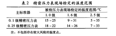 根據(jù)表1數(shù)據(jù),按照測試不確定度比不小于4:1的 要求,精密壓力表開展艦船壓力表現(xiàn)場檢定的溫度范 圍見表2。