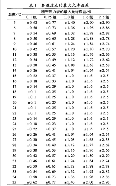 6級、2. 5級艦船壓力表在5 ~ 35T之間各溫度點的 最大允許誤差見表1。