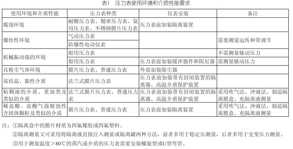 根據(jù)壓力表使用環(huán)境和被測介質(zhì)的不同,如環(huán)境溫度、腐蝕情況、振動(dòng)、介質(zhì)易燃易爆等,選擇不 同類型的壓力表,詳見表1。